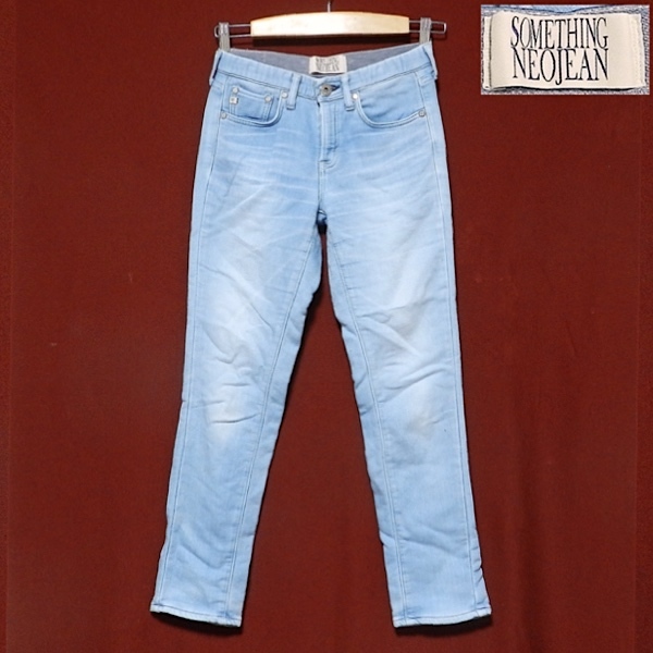 > SOMETHIG NEO JEAN サムシング ネオデニム ユーズド加工 デザイン デニム スエット パンツ スリム スキニー 紺 S 美品