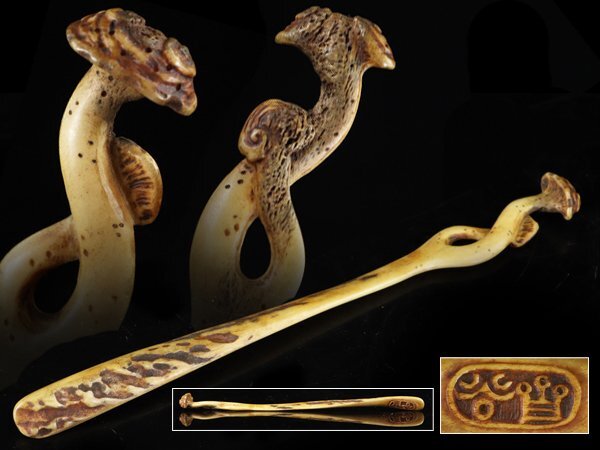 - 魁◆収集家放出 大手海外オークション入手品 江戸期名人厳選の逸品 名工 尾崎谷斎 谷斎在銘 霊芝差し根付 鹿角彫刻 超絶技巧!