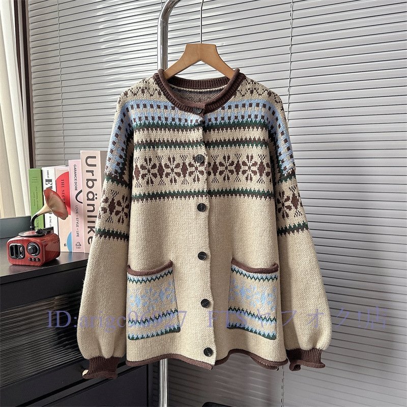 > A5358☆新品カーディガン セーター ニット 大人可愛い 着映え コート レディース 前開け ゆったり 暖かい 織り込み柄 グレー