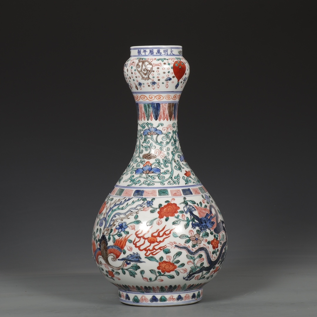 - 明 五彩龍鳳紋大蒜頭瓶「大明万歴年製」銘 唐物 箱付き 陶磁器 中国美術 古美術 置物 RG484