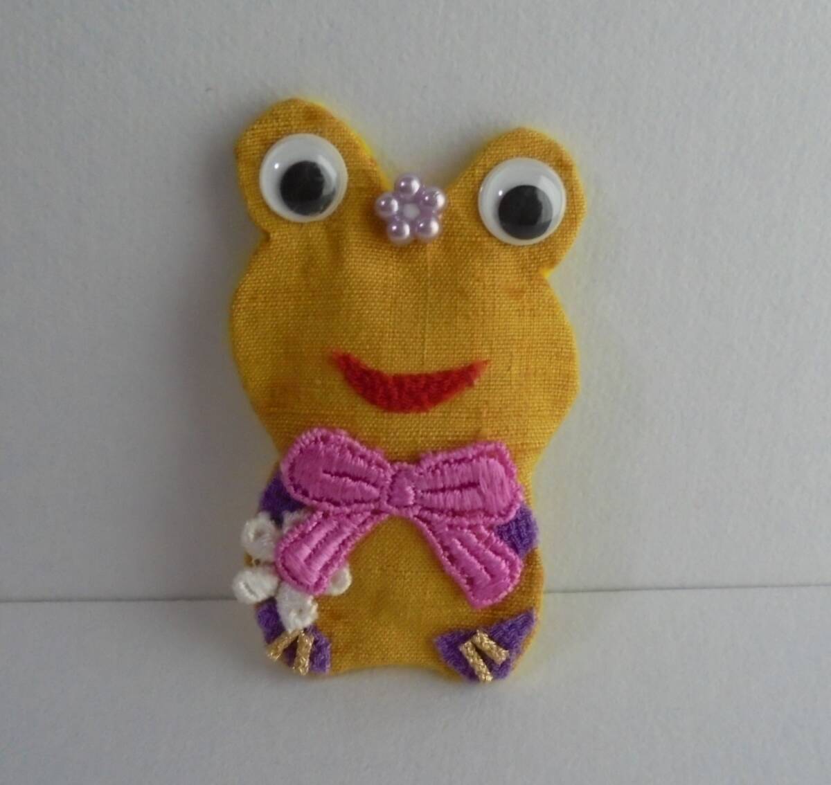 - ♪ ハンドメイド 蛙 カエル ブローチ 紬 リボンモチーフ お花ケミカルモチーフ 花型ビーズ 綿入り