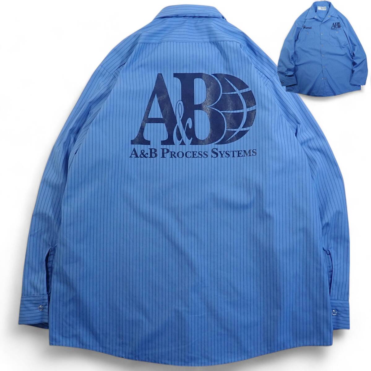 > 6143/WearGuard 長袖ワークシャツ L●ストライプ ブルー A&B PROCESS SYSTEMS●洗濯プレス済●ネコポス可●メンズ 古着