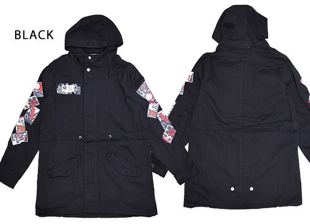 > 花札ストレッチモッズコート◆喜人 ブラックMサイズ KJ-42804 和柄 和風 ミリタリー きじん