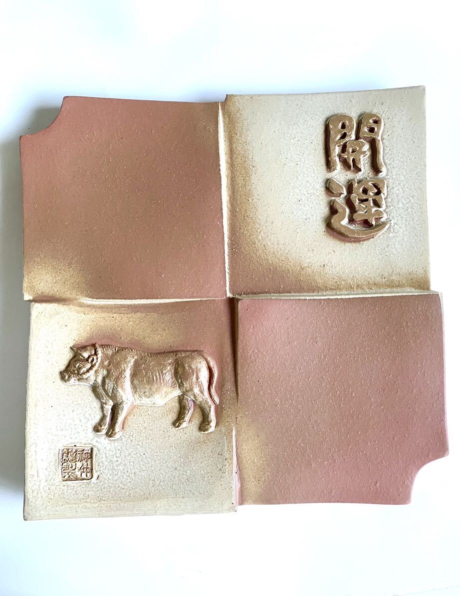 - 干支瓦(丑年) 「開運」四方格子 縁起物 牛 金彩 飾り瓦 うし