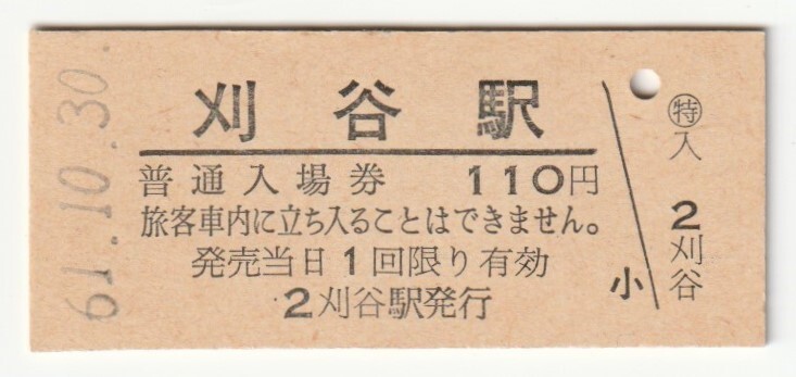 - 昭和61年10月30日 東海道本線 刈谷駅 110円硬券普通入場券