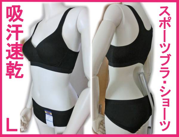 > 新品 吸汗速乾 スポーツブラ ショーツ モールドカップ ブラック L 上下セット ブラジャー ブラ パンツ セットアップ 黒 coolplus