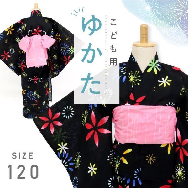 - 【お子様浴衣】120サイズ 7~8歳 花火 綿紅梅地 黒 夏着物 子供浴衣 綿100% 7UB32