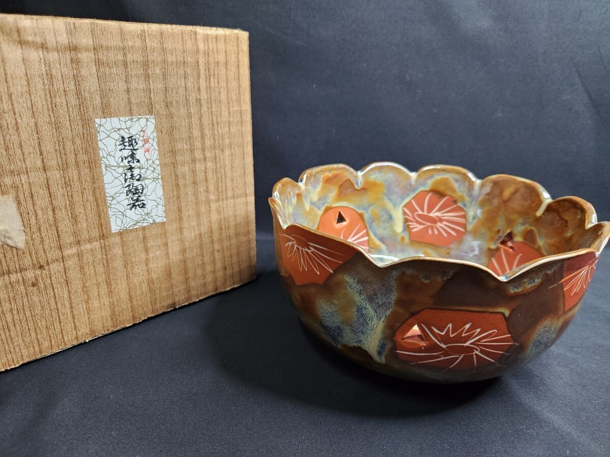 - ▼新品/未使用 京焼き 菓子鉢 天目 福寿堂謹製 窓 花柄 共箱 古美術 中鉢 菓子入れ 陶器 焼き物 鉢 盛器