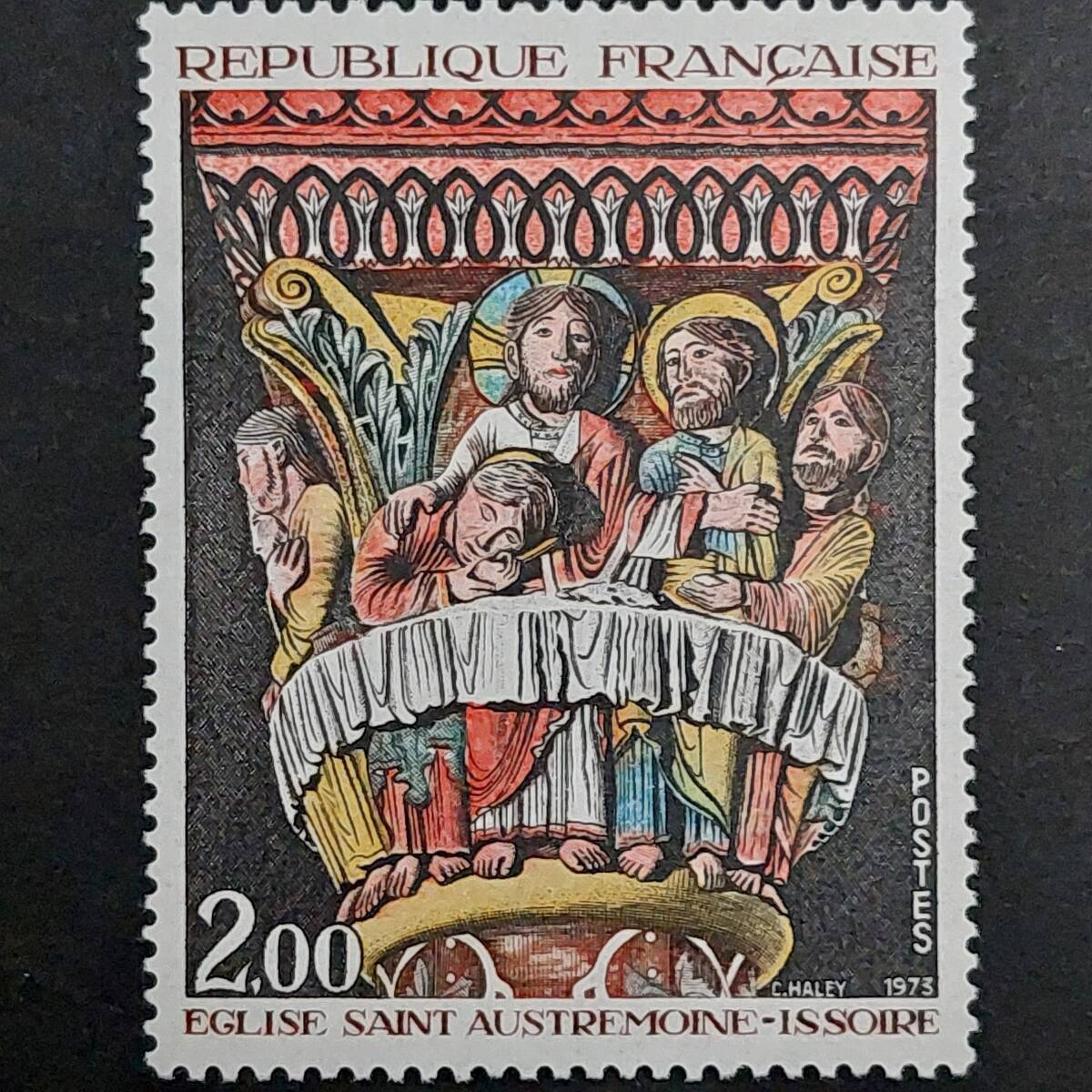 - K116 フランス切手「イソワールのロマネスク様式のサン・オーストルモワンヌ教会のレリーフ(浅浮彫り)『最後の晩餐』」1973年発行 未使用