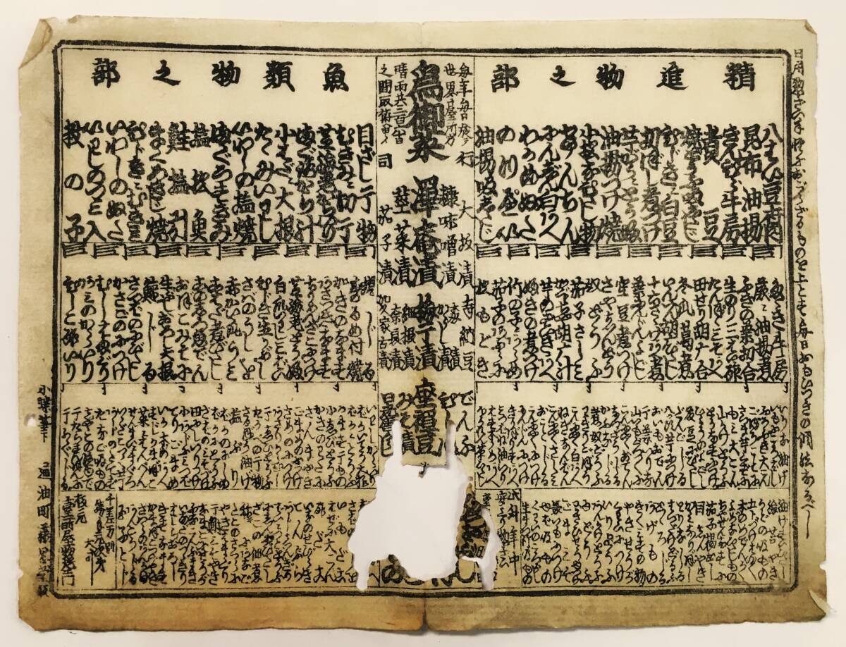 - 江戸期 見立番付「為御菜 精進物之部/魚類物之部」木版 摺物 料理 惣菜 おかず