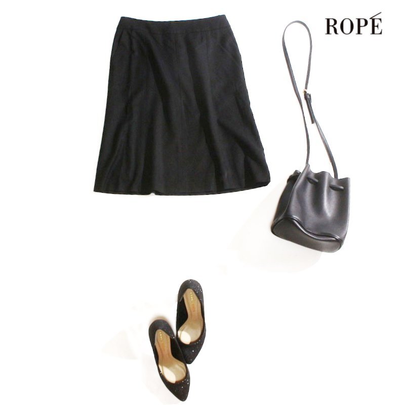 > 美品 ROPE’ ロペ 合物 定番 膝下丈 ポリエステル レーヨン 膝下丈 タイトめ Aライン スカート 7号 ブラック 黒