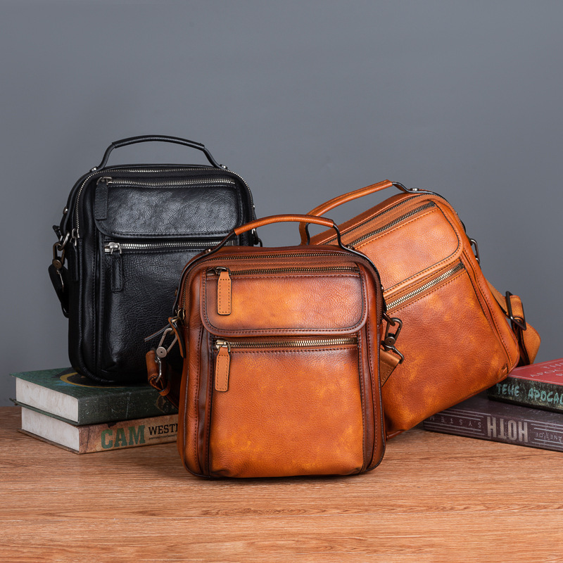- 未使用 メンズ アンティーク 本革 ショルダーバッグ 斜め掛け鞄 メッセンジャーバッグ 2室 牛革 レザー 縦型 iPad収納 ヌメ革 本革