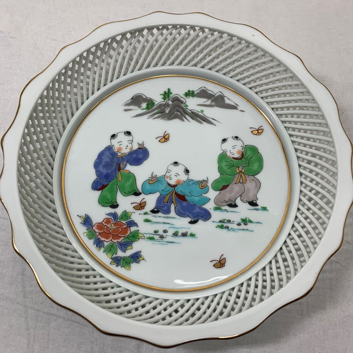 > ★大阪/店舗受け取り可★有田焼 暢山作 菓子鉢 菓子入れ 飾り皿 器 陶器 インテリア 網透かし 色絵 金縁 約直径25cm 高さ4.5cm★