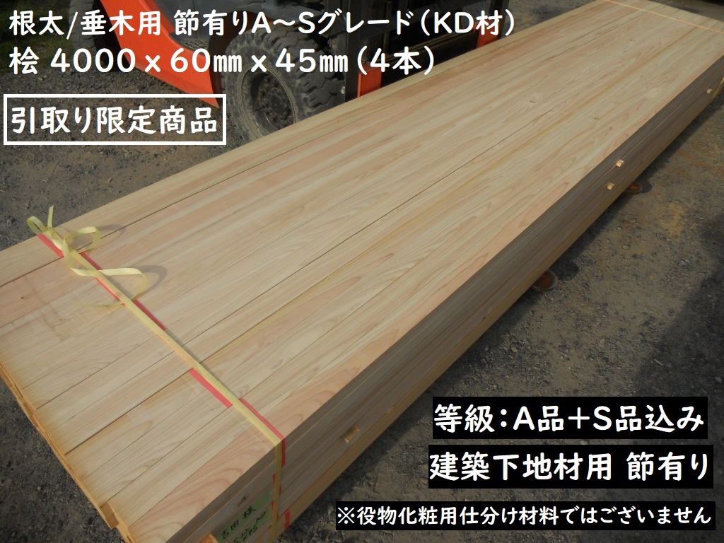 > 引取【4本/束】 桧 KD特等SA 4000x60x45mm 節有 簡易プレーナー 建築構造材 下地材料 根太 屋根 垂木 ヒノキ 檜 乾燥 木材 材木 DIY ひのき