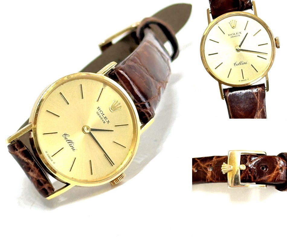 - 美品 ROLEX ロレックス チェリーニ 金無垢 K18 YG ゴールド シャンパンゴールド 手巻き 時計 クロコ レザーベルト 王冠 飛び出し