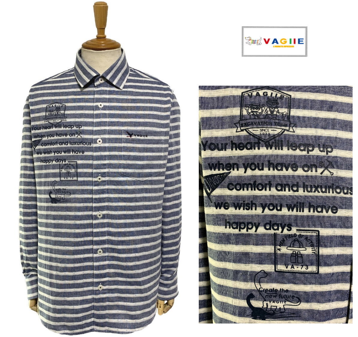 - VAGIIE バジエ ボーダー柄xダイナソープリント 長袖シャツ 紺x白ボーダー size46 M