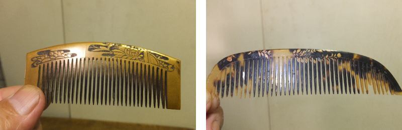 - ▲こ-661 最高級品「くし2点」金蒔絵 江戸時代 櫛 かんざし 古いお品 大きい方:縦3cm長さ11cm厚さ2cm
