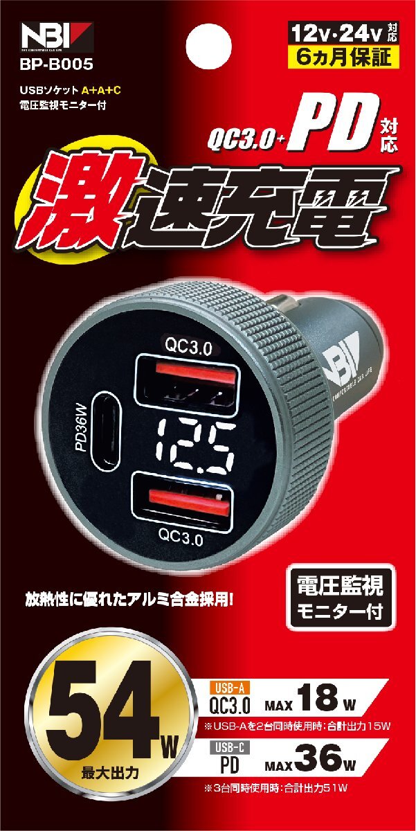 - 車用充電器 激速充電 USBソケット A+A+C 電圧監視モニター付き (BP-B005)