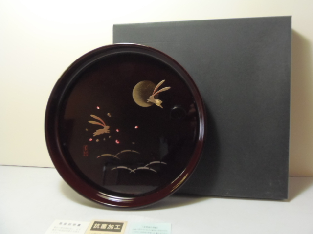 - sk177 【丸盆 30センチ】 溜塗 夢うさぎ 金箔貼り蒔絵 ※難有(傷有)