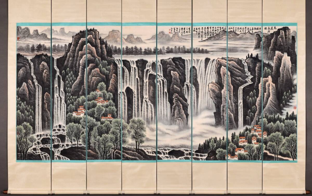 - 古美術 掛け軸 中国・近現代 「李可染書」 紙本 【雲山飛瀑図 通景八条屏】 立軸 書道 巻き物 肉筆保証 唐物 古画 LT-2410217