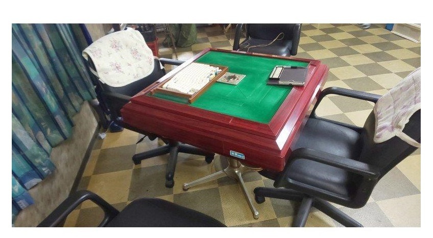 - c3A【新長イイ田代040216(3)】麻雀卓台 全自動マージャン 100V 50/60Hz 高級椅子4脚物置台セット付 テーブル四方枠一部キズはがれあり