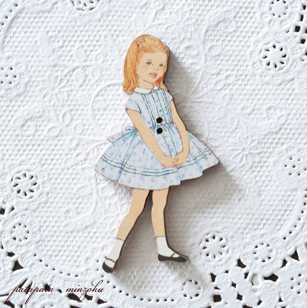 - 青い小花柄のワンピースの女の子 フランス 製 木製ボタン アトリエ ボヌール ドゥ ジュール 小物 雑貨 パタミン ボタン 刺繍 ハンドメイド