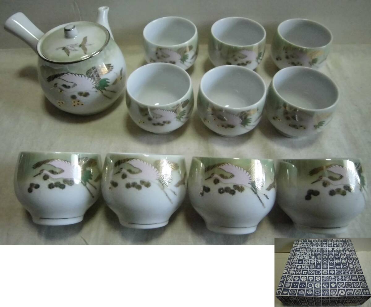 > 茶器揃 急須 湯呑み茶碗 10客 セット 鶴柄 箱入り 金彩 ラスター 光沢 茶器 茶道具 陶器 工芸品 レトロ