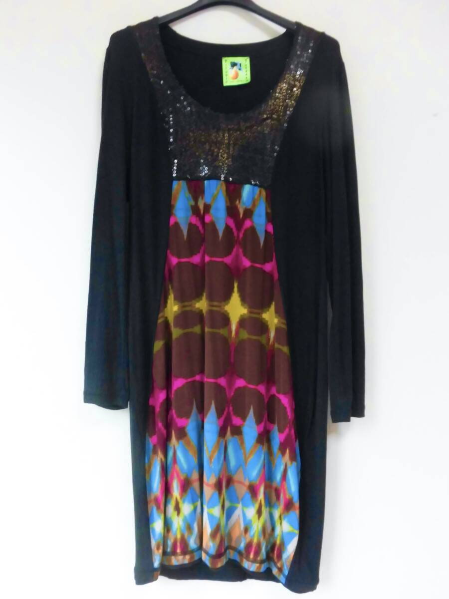 - ●美品memo's メモス /イタリー製/黒カラフル総柄切り替え/長袖 ワンピース/ 黒ビーズ飾り/サイズM~L相当