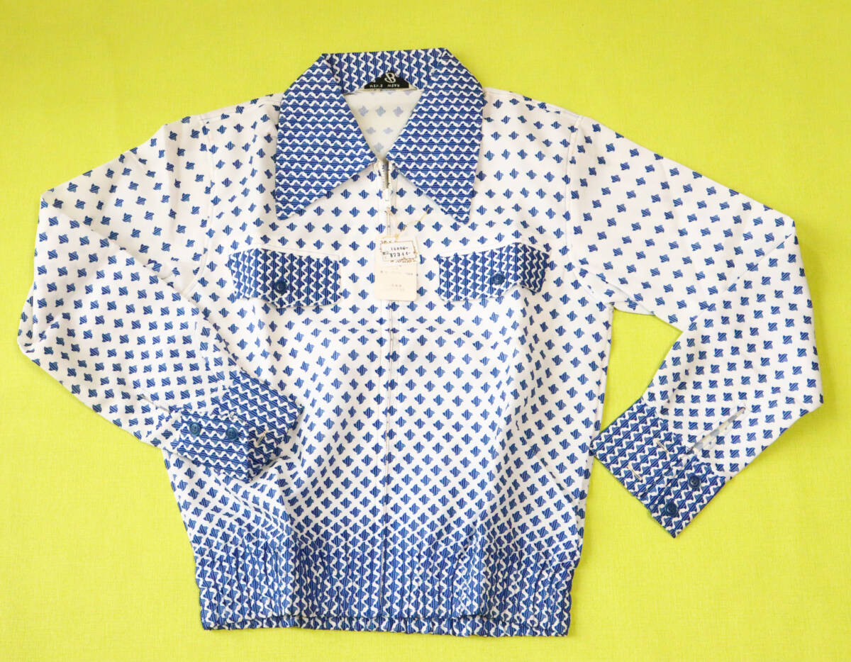 > rm1246 昭和レトロ ブルゾン ジャンパー M ブルー 総柄 春秋 幾何学 ショート丈 メンズ