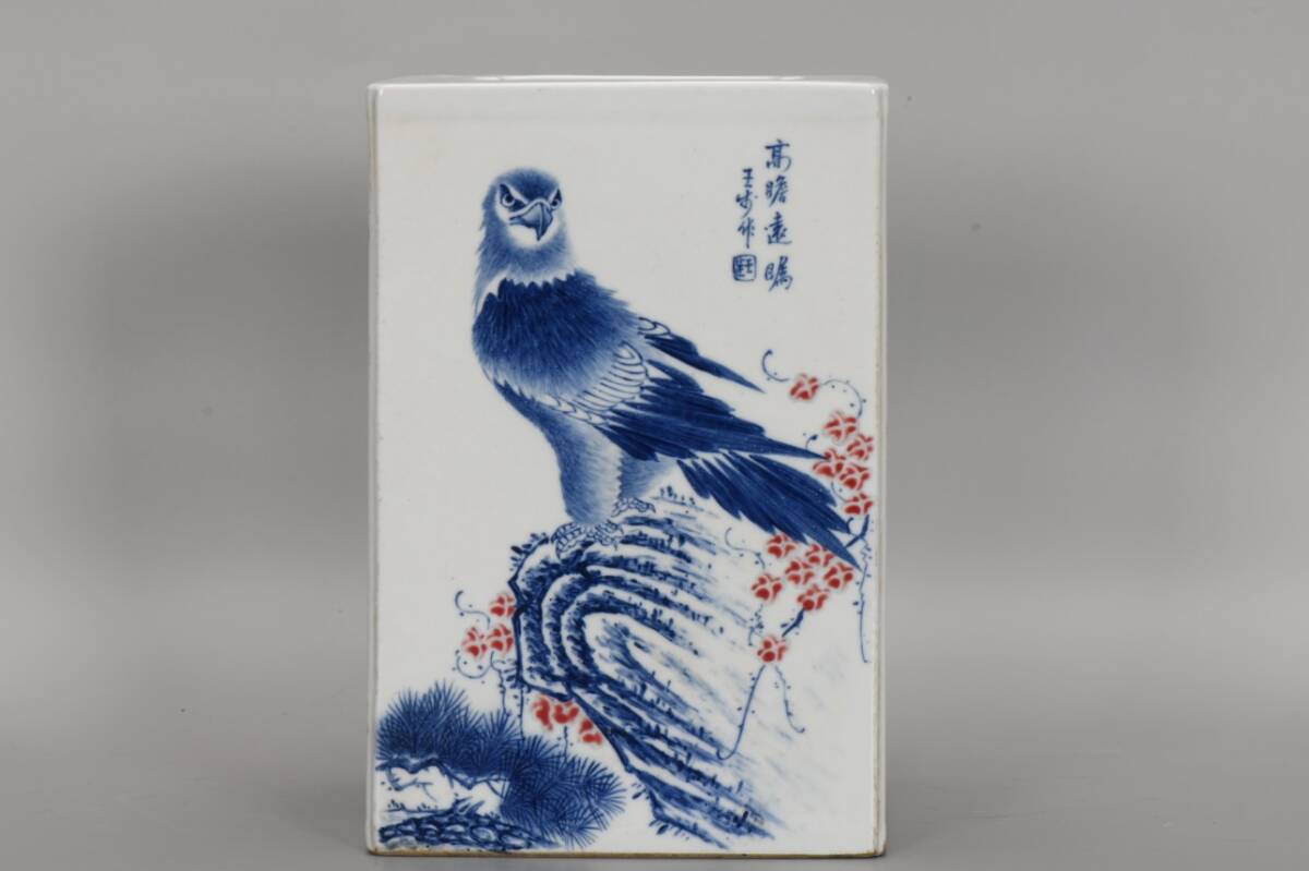 - ◆蔵出◆古美術 中国古玩 民國時代 青花釉里紅 花鳥紋四方筆筒 時代物 A3