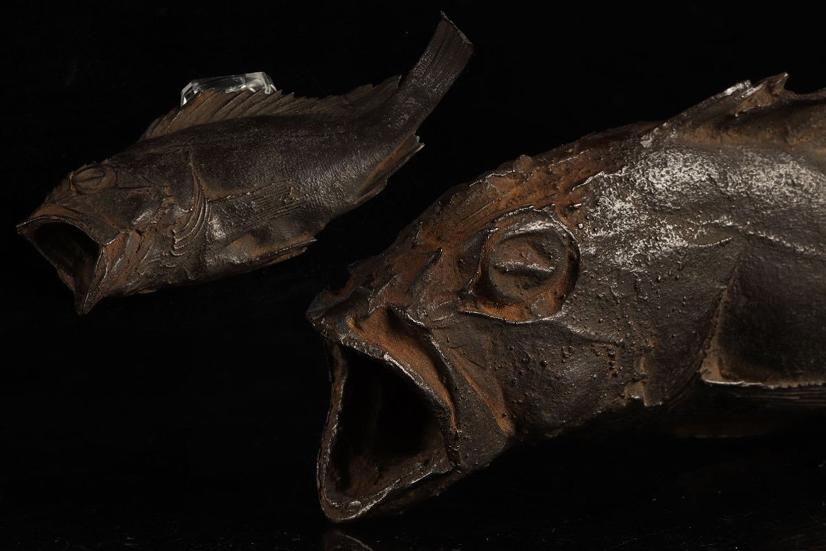- [ギャラ藤]時代物/古銅魚形書鎮/約500g/G-468(検)骨董/銅器/銅製/文鎮/鎮紙/熨斗押/書道具/硯/筆/墨