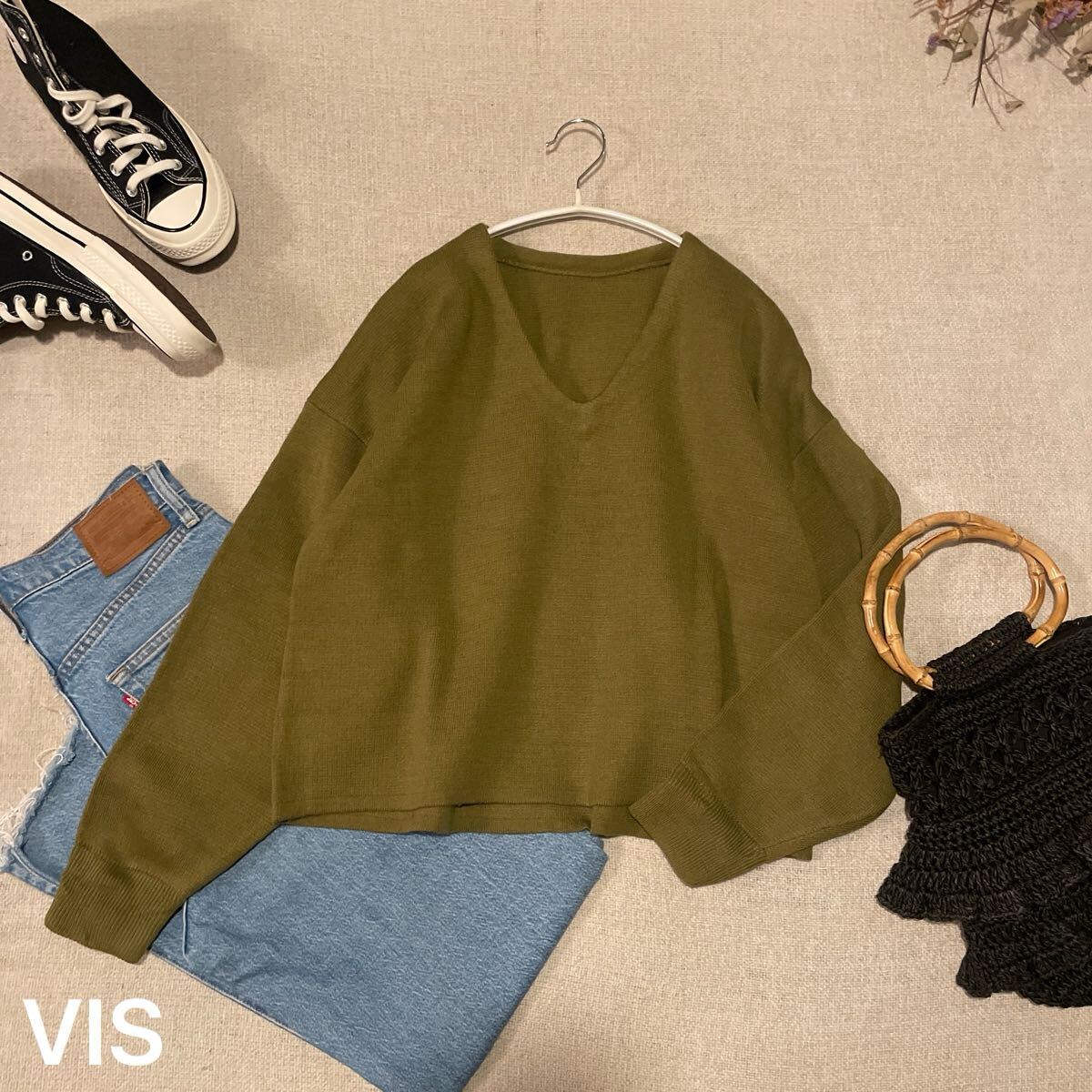 > VIS セーター ニットトップス ショート丈 カーキ レディースMサイズ 長袖 ヴィス ビス Vネックニットプルオーバー 大人可愛い