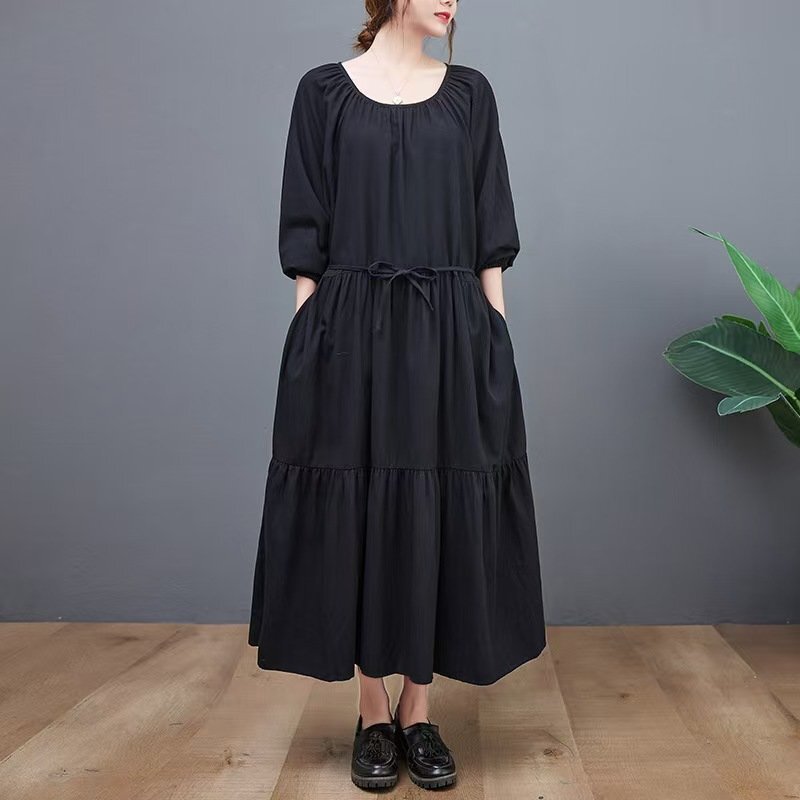 - LRM4811★秋 新品 ロング ワンピース ゆったり 無地 体型カバー きれいめ 長袖 30 40 50代 大きいサイズワンピー