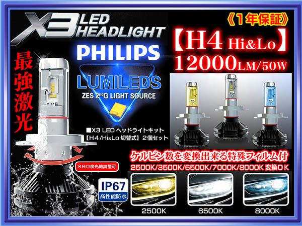 > いすゞ車24V/X3【H4 Hi/Lo切換】最新版LEDヘッドライト1年保証♪12000LM/6500K/50W♪12V/24V♪フイルム付2個♪PHILIPS車検対応