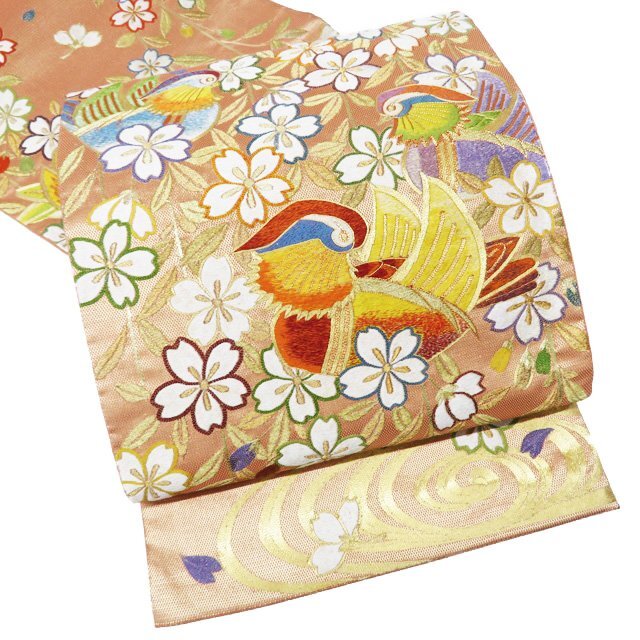 - 袋帯 中古 リサイクル 正絹 フォーマル 仕立て上がり 六通 金駒刺繍 桜と鴛鴦の図 流水 箔糸 赤香色 多色 金 きもの北條 A1112-13