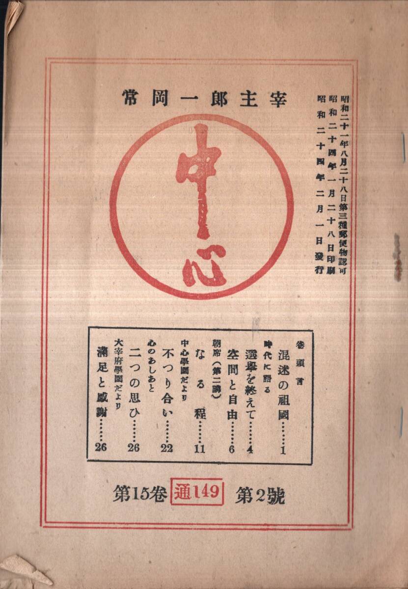 > ※常岡一郎主宰・中心通巻第149號 巻頭言混迷の祖国・空間と自由・大宰府学園だより等々 昭和24年中心社発行 参議院議員・天理教等