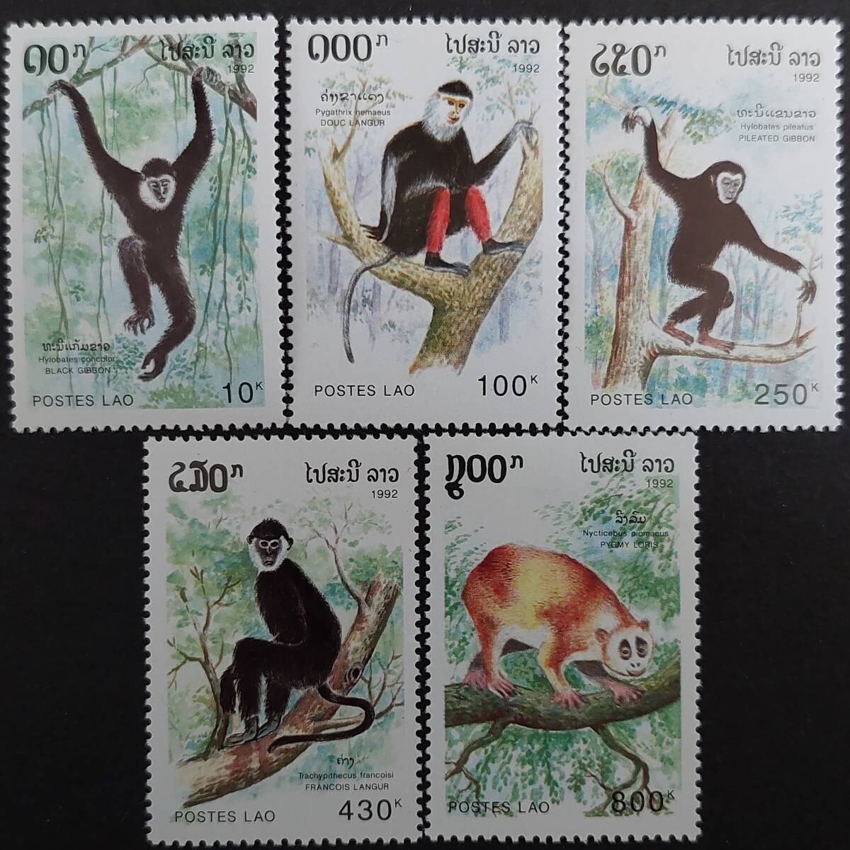 - K248 ラオス切手「猿のデザイン切手5種完 クロテナガザル、アカアシドゥーク、エボシテナガザル、フランソワルトン他」1992年発行 未使用