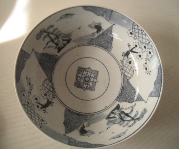 - 古い染付の深鉢 大鉢 皿 器 松と梅の図 味のある器 外径24.5×H9.5㎝/24N11.7-16