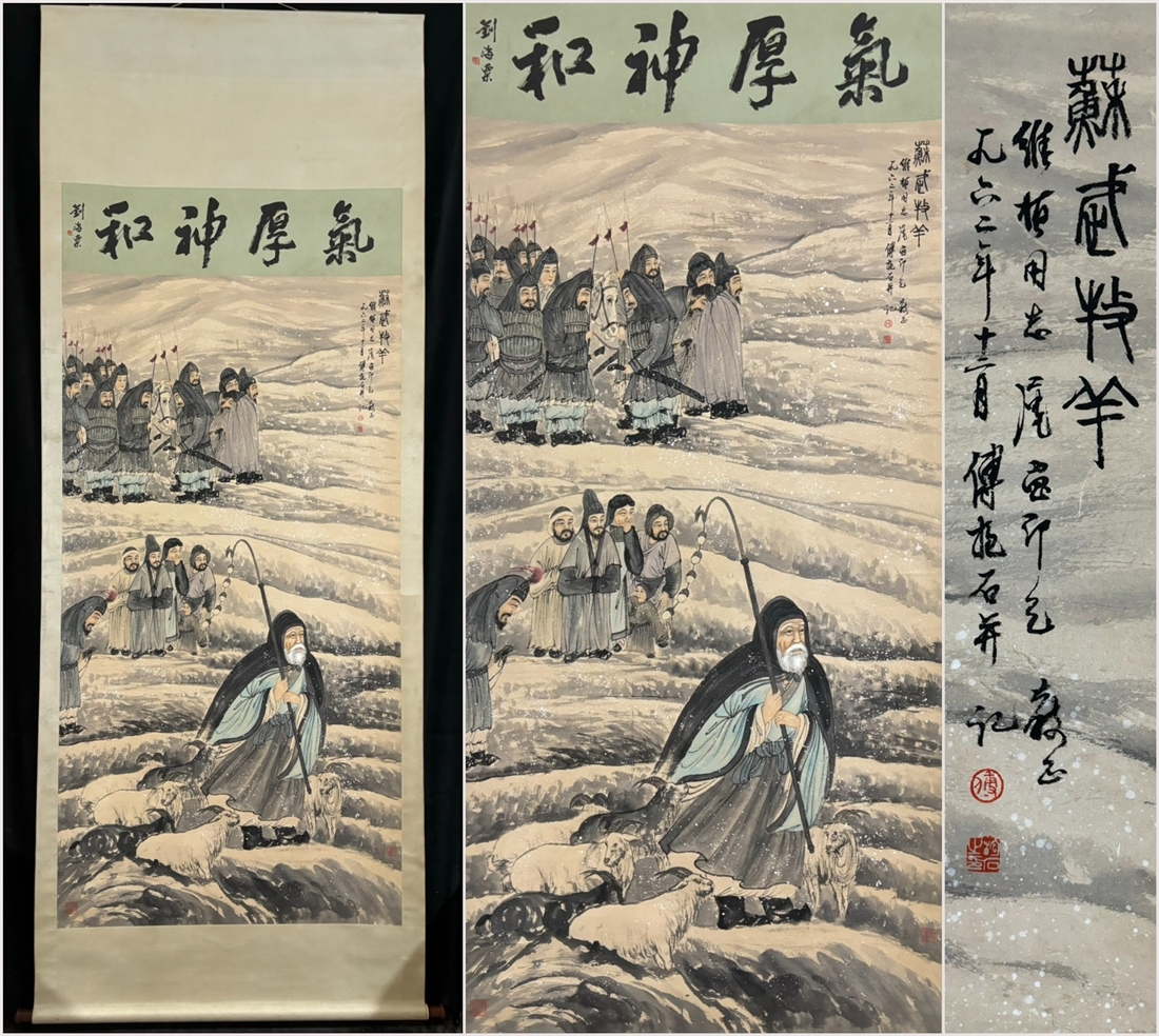 > 古美術 掛け軸 中国・近現代 「傅抱石書」 紙本 【蘇武牧羊図】 立軸 書道 巻き物 肉筆保証 唐物 古画 画心179.5x94cm LT-2411148