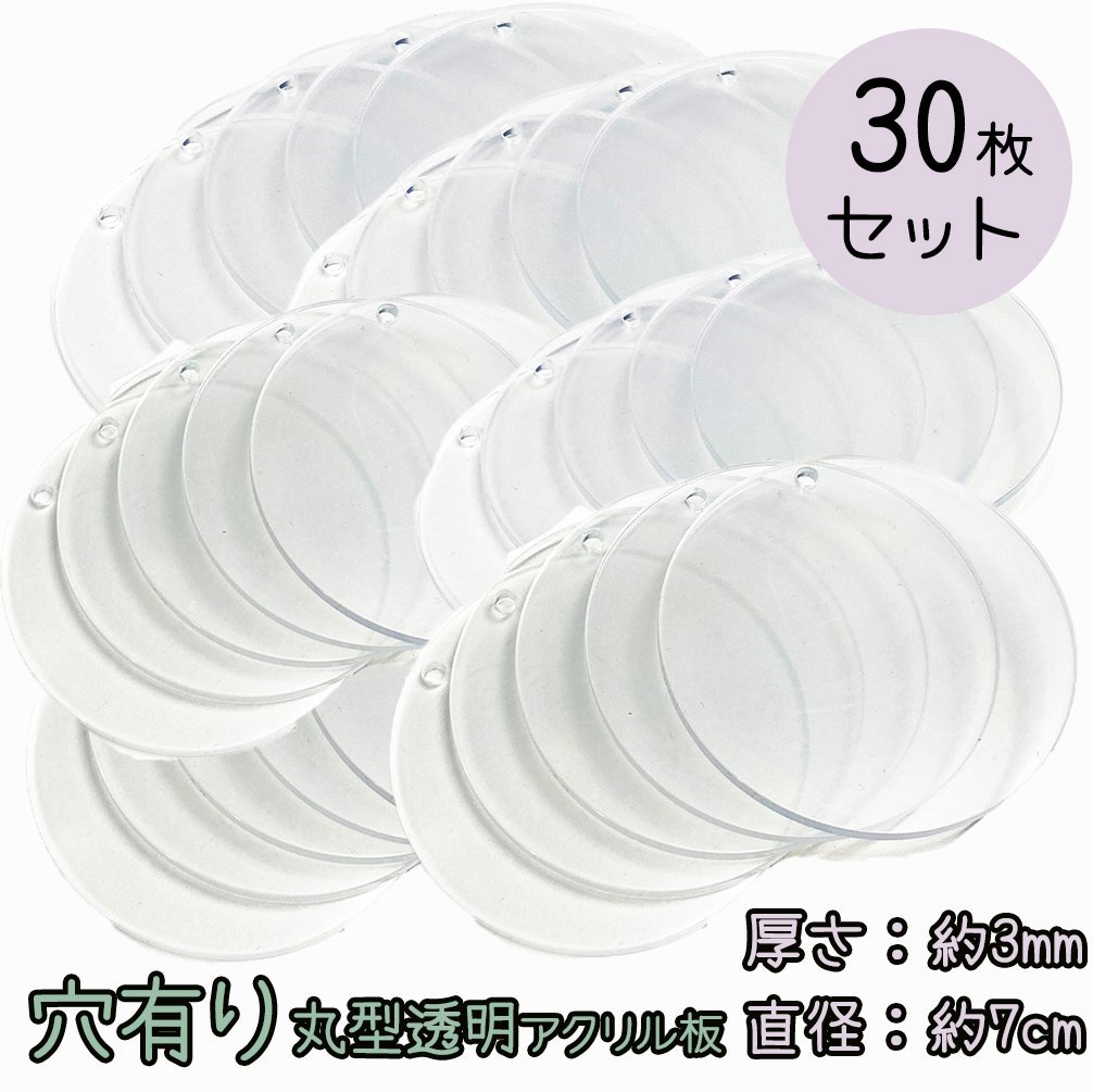 - 【ハンドメイド】穴あき 円形 アクリル板 30枚 セット クリア 透明 素材 工作 直径7cm 厚み3mm 丸型 製作用 まとめ買い プレート 手作