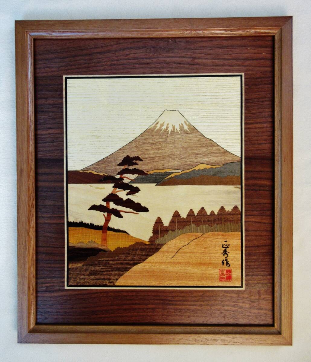 - 昭和レトロ箱根木象嵌 富士山風景画【木象嵌師 長澤正秀作】昭和50~60年 栞、化粧箱付き