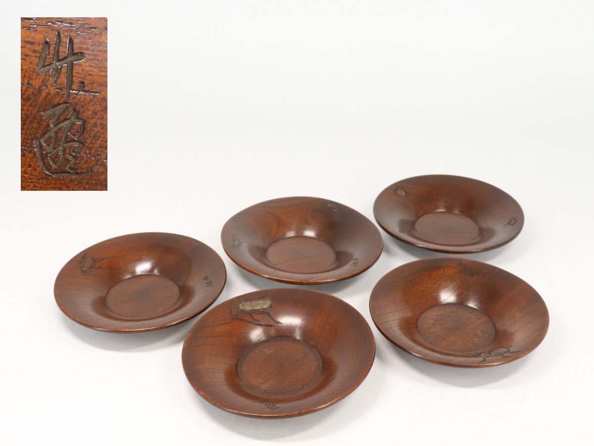 - 【蔵】狭貫彫 讃岐彫 佐々竹僊 刀 茶托 5客 昆虫の図 絵替文 天然木 S2422F