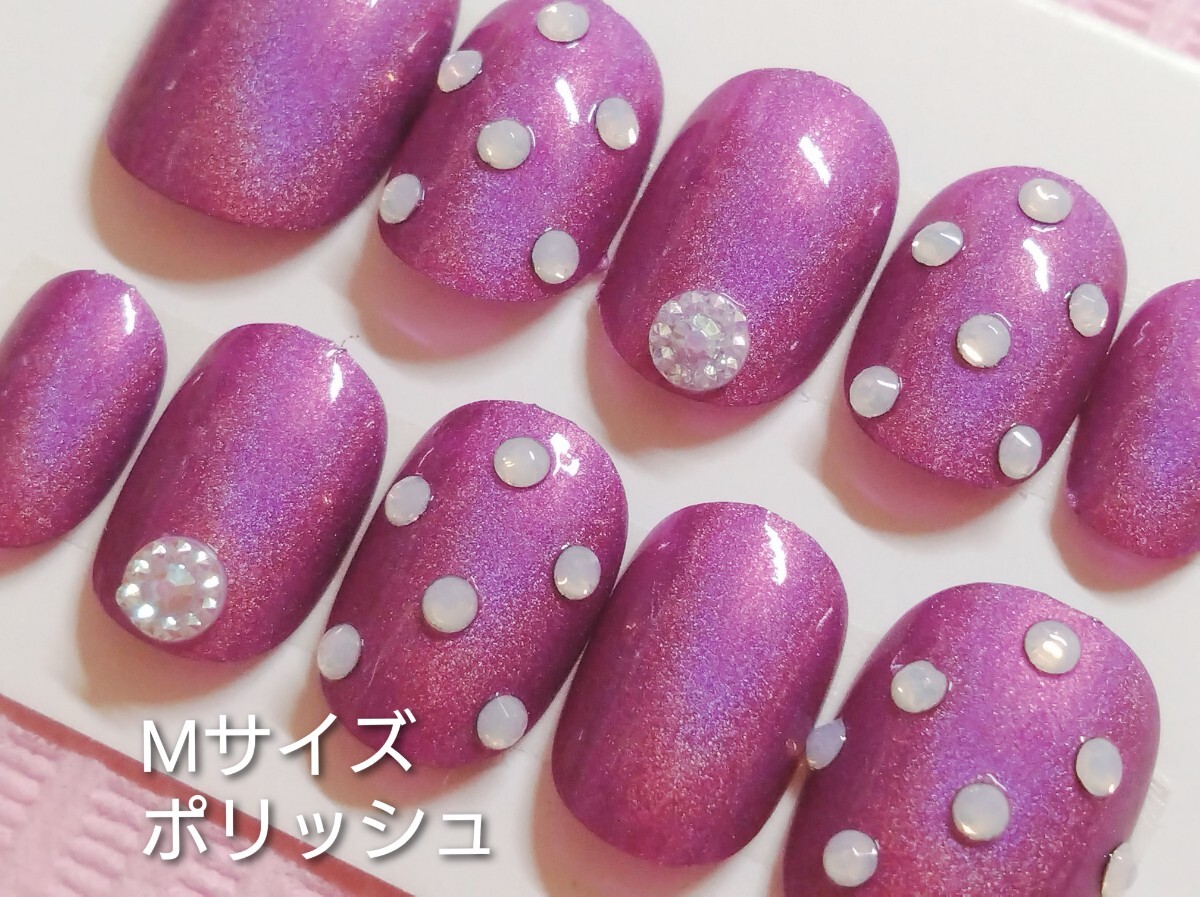 - Mサイズベリーショート・オーロラメタリックローズピンクベースドットミルキーストーンネイルチップ