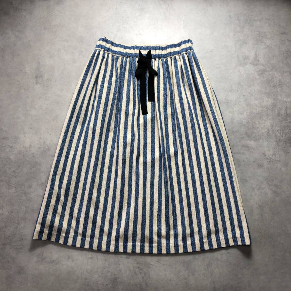 > WQ046●trois:ウエストリボンストライプスカート●F●BLUE×BEIGE トロワ MADE IN JAPAN