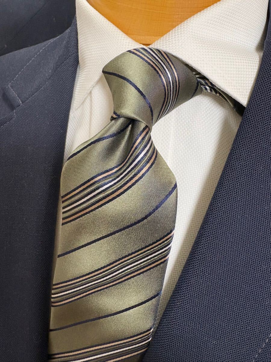 - 【未使用】EVOLUTO ストライプネクタイ 大剣約8cm モスグリーン基調 日本製 高級シルク