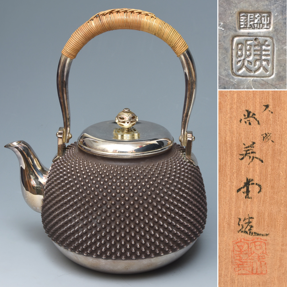 - 純銀 大阪 尚美堂(造)霰打銀瓶 湯瓶 663g SILVER 銀 茶道具 煎茶道具 金属工芸 唐物 茶道 銀器 水注 鉄瓶 湯沸 共箱 茶器 古美術 z9108o