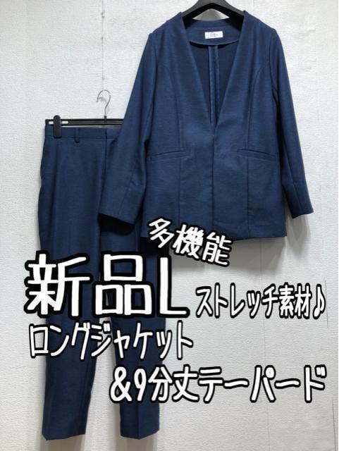 - 新品☆Lブルー系♪リネン調♪ロング丈ノーカラー&テーパードパンツスーツ☆r844