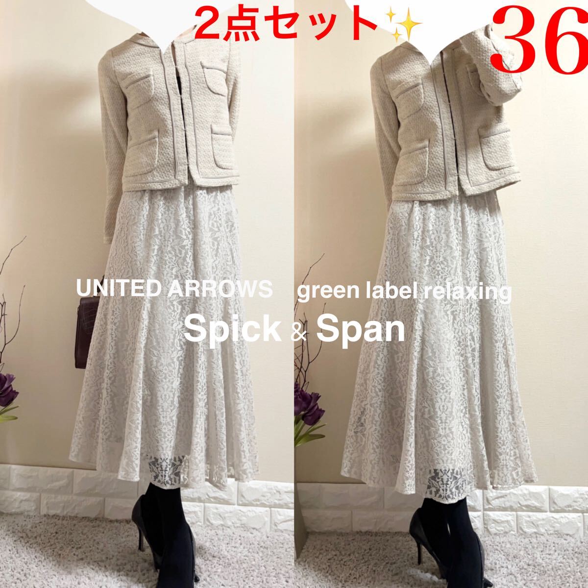 > S スーツ!ユナイテッドアローズ UNITED ARROWS green label relaxing ツイードジャケット スピック&スパン スカート 36 ベージュ