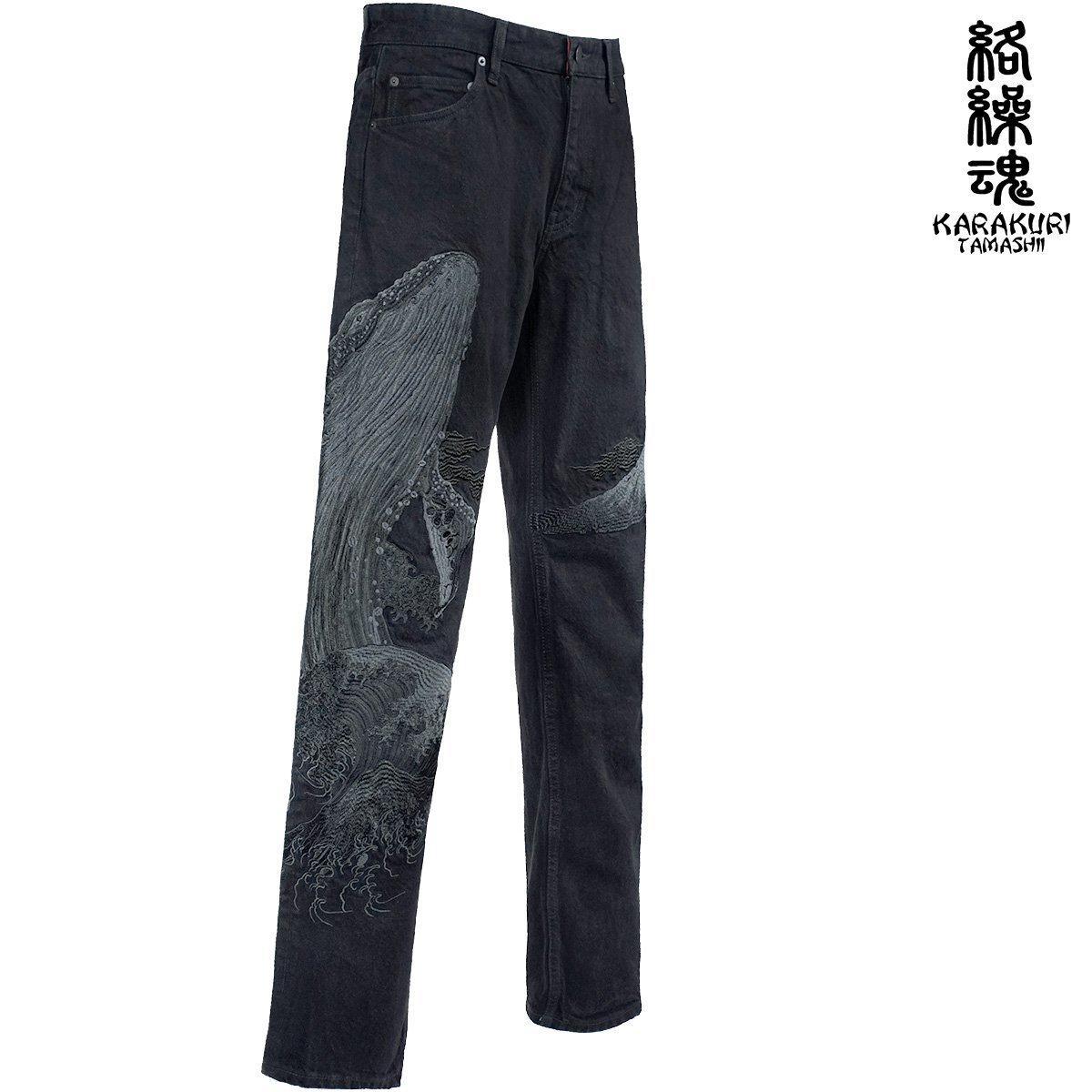 > 243235-20 絡繰魂 漆 デニム 和柄 総刺繍 クジラ 富士山 ロングパンツ メンズ(ブラック黒) 30 からくり 波 5ポケット 鯨×富士波