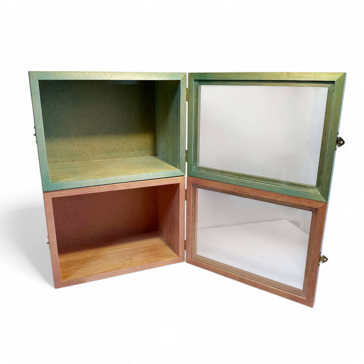 > N2393 フェリシモ 木製 飾り棚 ガラス扉付 ボックス2個セット ピンク/グリーン コレクションケース ディスプレイ